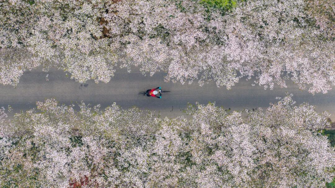 清晨的薄雾还未散尽,阳光透过层层叠叠的花瓣,洒下斑驳的光影,落在蜿蜒的村道上,落在路边的田埂间,也落在早起村民的肩头。远远望去,樱花树沿着村路一路延伸,枝桠交错,织成一条天然的粉色长廊,仿佛走进了童话世界,每一步都踩在浪漫的诗行里。