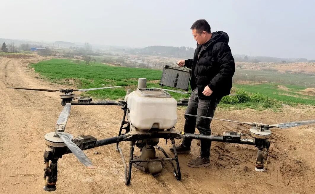 在赵棚镇的田埂上,杜米米手握无人机遥控器,一边熟练地设置参数,一边耐心地跟身边的实习机手讲解要领。他在屏幕上框选出当天的作业区域,点击“确定”,无人机便“嗡”地启动,贴着麦浪向高空飞去,不一会儿的工夫它就“收工”了。