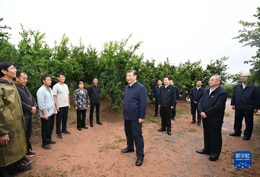 9月24日,中共中央总书记、国家主席、中央军委主席习近平在浙江考察结束返京途中,来到山东省枣庄市考察。这是习近平在位于峄城区的冠世榴园石榴种植园同老乡们亲切交流。新华社记者燕雁摄