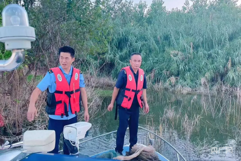 彭涛(左)正在长江通江支流金水河水域巡护(央广网发 江夏区农业综合执法大队 供图)