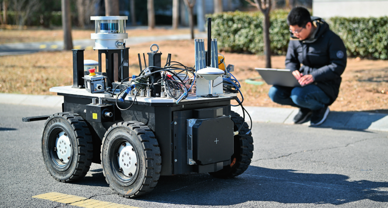 工程师在京津中关村科技城道路上对一款防爆轮式巡检机器人进行路测调试(2025年2月20日摄)。孙凡越摄/本刊