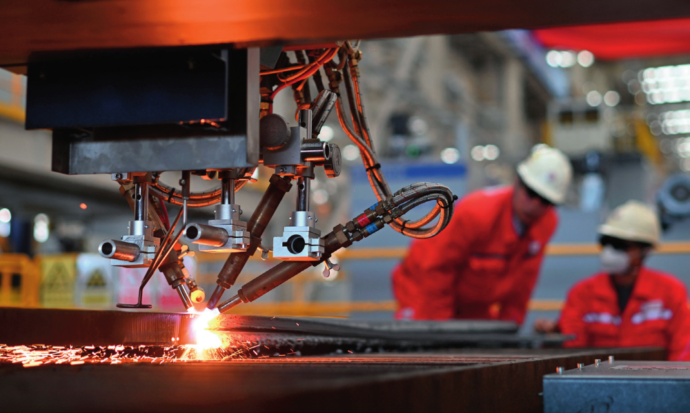 工作人员在海油工程天津智能制造基地制管作业车间调试数控切板机(2024年10月10日摄)。赵子硕摄/本刊