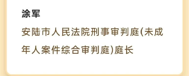 “办案只是末端,治理必须前端。”涂军积极推进未成年人犯罪预防和保护工作,协助教育部门实现全市70余所中小学“法治副校长”全覆盖,创新“法院开放日+模拟法庭”模式,年均开展普法活动40余场。对涉罪未成年人坚持“教育、感化、挽救”方针,发动全院干警力量建立“一对一”“手拉手”帮教机制;判决生效后结合案情撰写“判后寄语”,帮助未成年罪犯树立正确价值观;建立回访帮教制度,持续跟进帮扶。