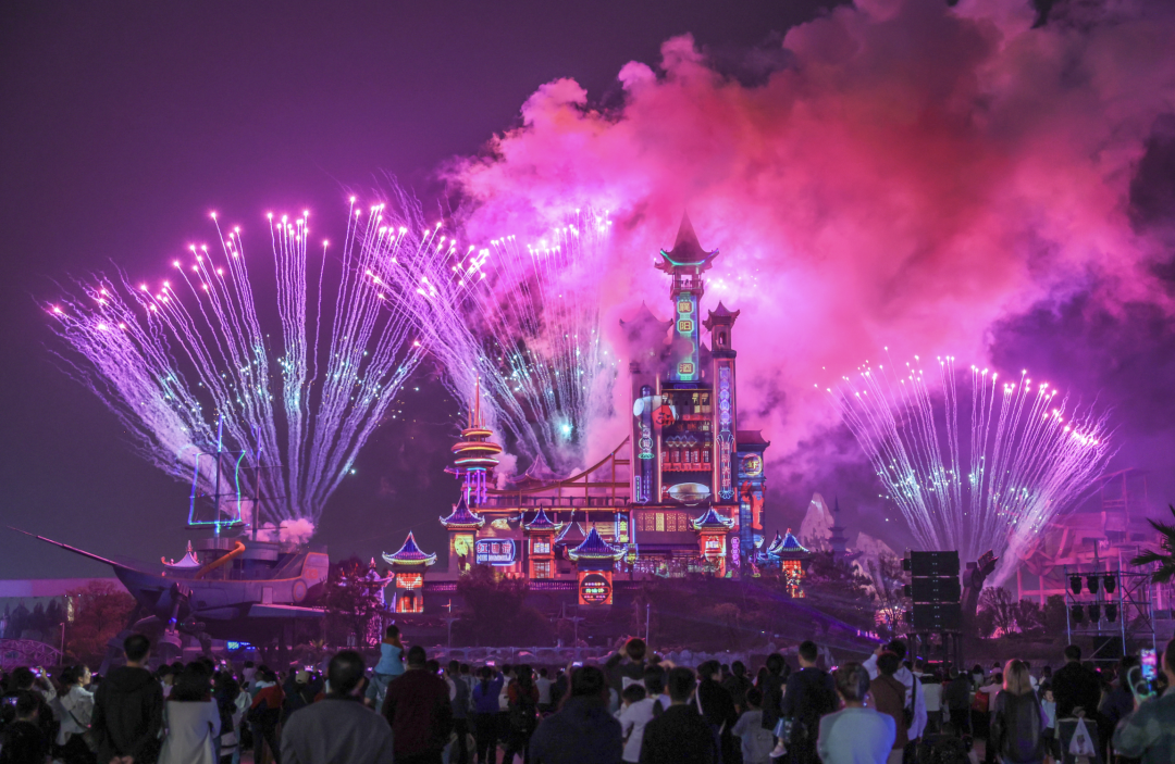 游客在襄阳市华侨城奇幻度假区观看奇梦城堡光影秀(徐敏|摄)