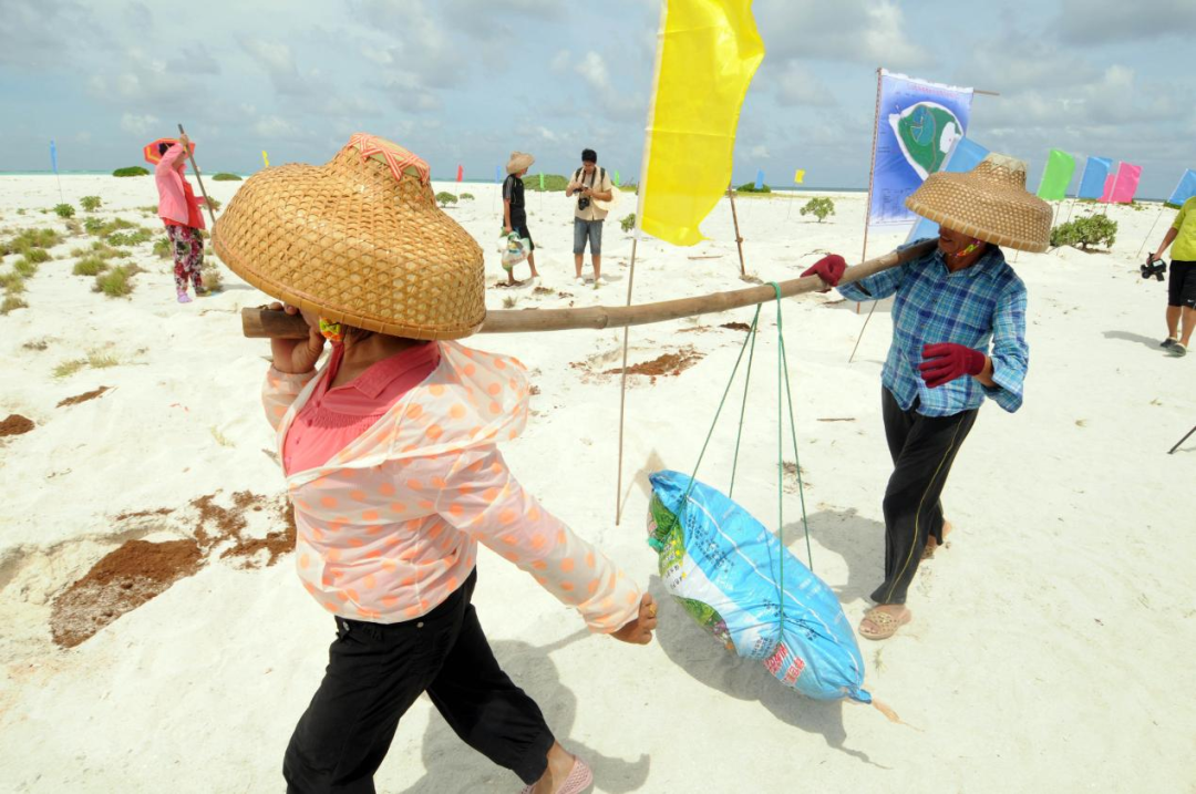 2014年7月24日,工人们将适合植物生长的土壤运送到西沙洲上。新华社记者 魏骅 摄