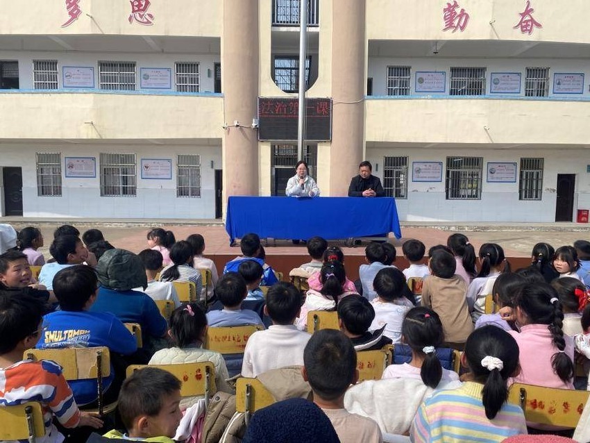 春日的操场上,学生们整齐列坐,气氛热烈。活动以“与法同行——青春路上的红绿灯”为主题,棠棣司法所工作人员针对小学生的年龄特点,摒弃枯燥的法条堆砌,通过真实案例讲解与沉浸式问答互动,将法律知识融入校园生活场景。