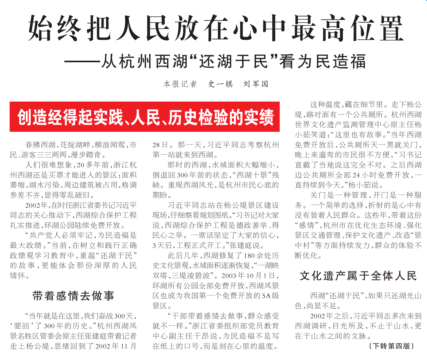 始终把人民放在心中最高位置——从杭州西湖“还湖于民”看为民造福