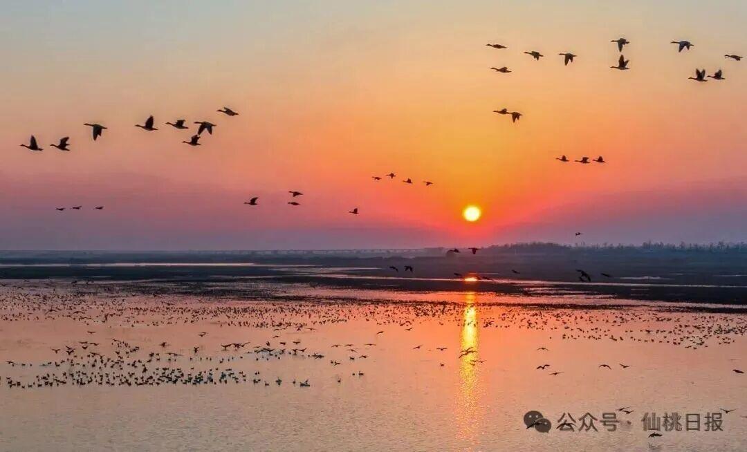 沙湖湿地的十万芦花、翩翩候鸟,在夕阳下跳一曲浪漫的“华尔兹”。(刘贤双 摄)至于美食,君有牛肉面,汤滚肉烂,一辣入魂;有黄酒,醇厚甘冽,可壮行色。吾亦携沔阳三蒸,粉糯鲜香,笼屉掀开如春云;毛嘴卤鸡,皮脆肉嫩,骨亦含芳;仙桃黄鳝,滋补佳品,下饭尤妙。赛后当共设一席,以物换物,以味交心。风味虽殊,其本则一,皆汉水之畔烟火所成。