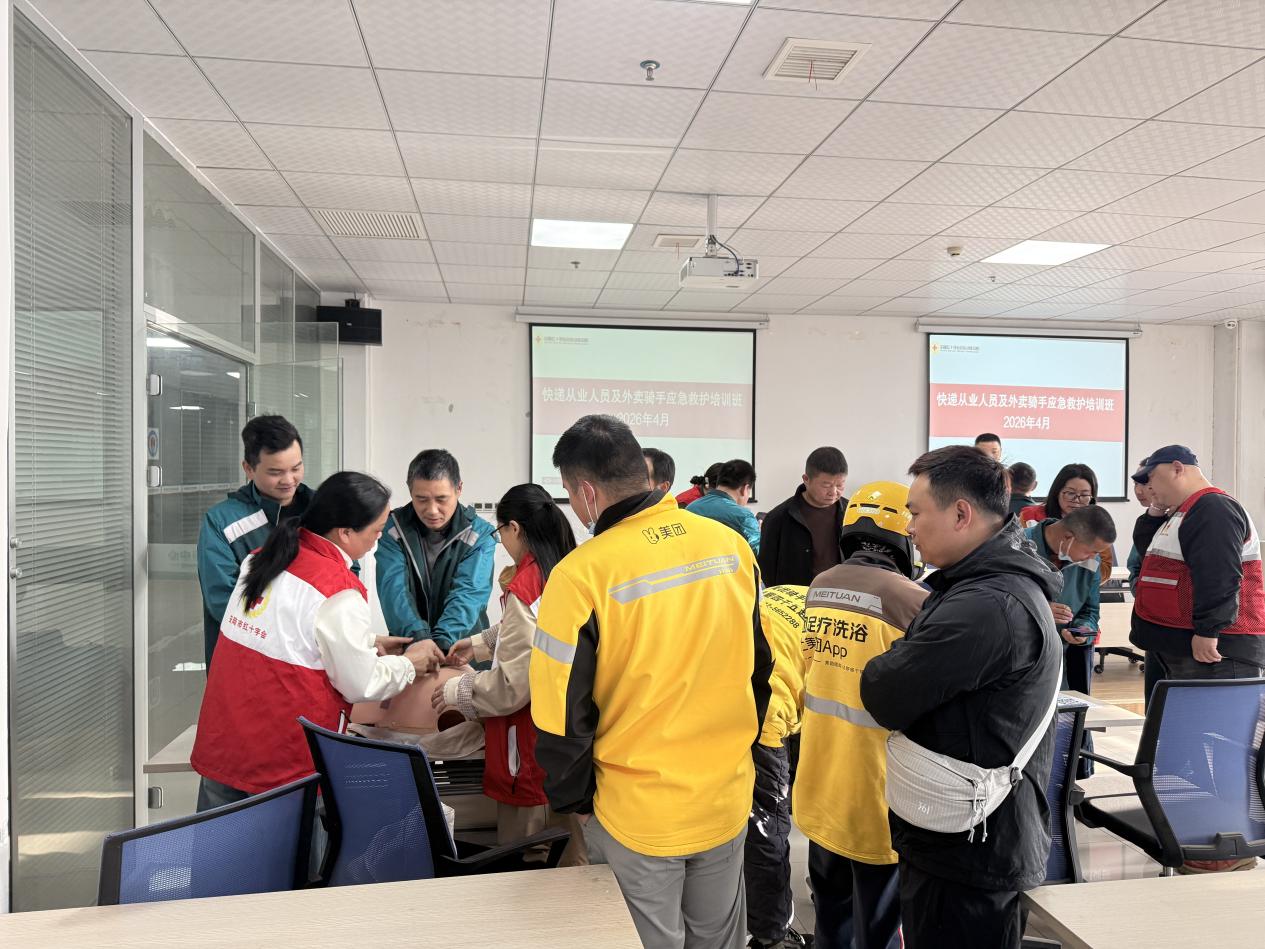 培训现场,红十字会专业讲师结合外卖、快递骑手户外作业时间长、路面交通风险高的职业特点,重点讲解了心肺复苏(CPR)、AED自动体外除颤器使用、气道异物梗阻急救、常见意外伤害处置等实用急救知识。讲师手把手演示心肺复苏按压、人工呼吸、海姆立克急救法等的标准操作流程,并逐一纠正学员的动作细节。参训骑手和快递员踊跃参与实操演练,认真练习各项急救技能,在沉浸式实践中熟练掌握急救要领,有效提升了现场应急救护的实操能力。