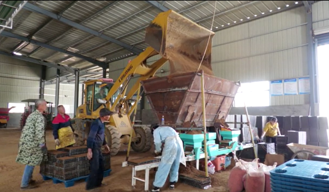 走进育秧工厂,最打眼的就是流水线源头那台育秧下土机。过去,上料这个环节至少得四个人忙前忙后,现在一个人就能轻轻松松搞定。工厂另一侧,新购入的叉车灵活穿梭,把成摞的秧盘稳稳托起、码放整齐——过去搬盘码盘的“人海战术”,如今变得轻松又高效。