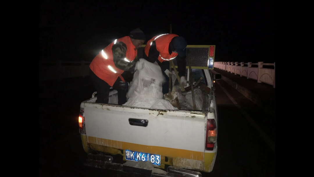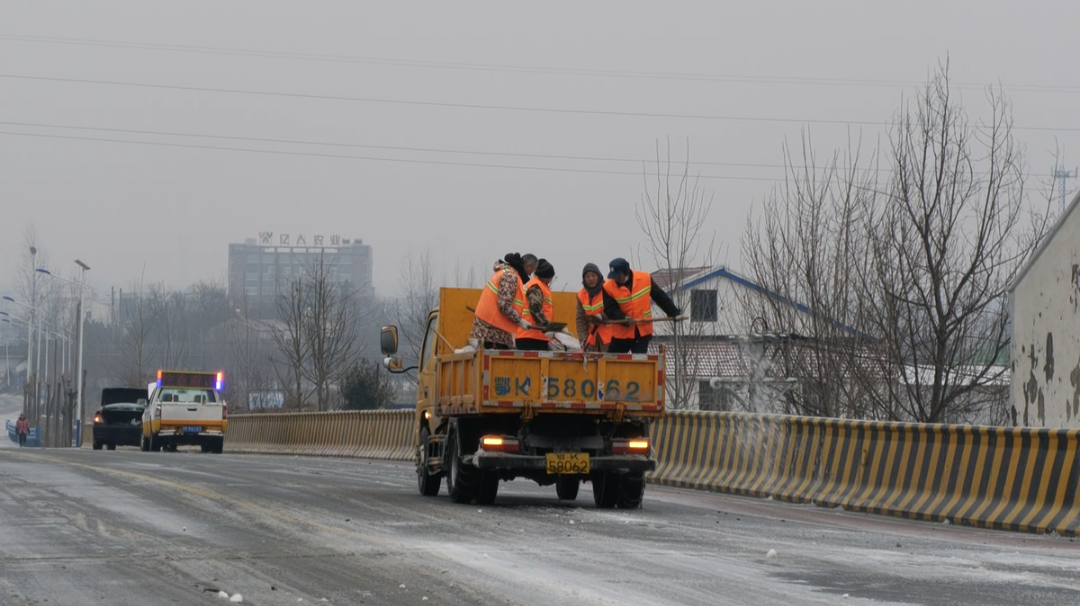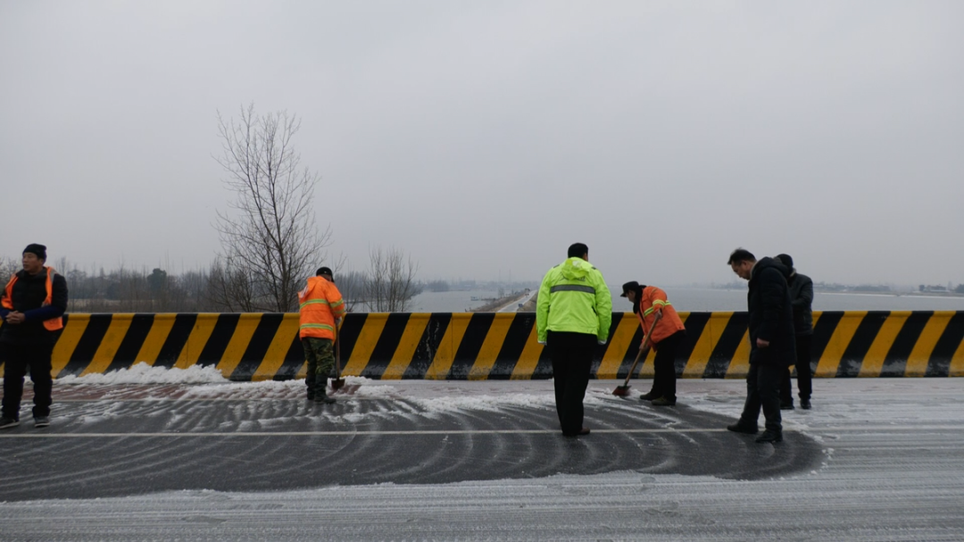 这座桥是连接东西乡镇的主干道,车流量、人流量大,我们组织了2个突击小组,24小时值班值守,除雪保畅通。