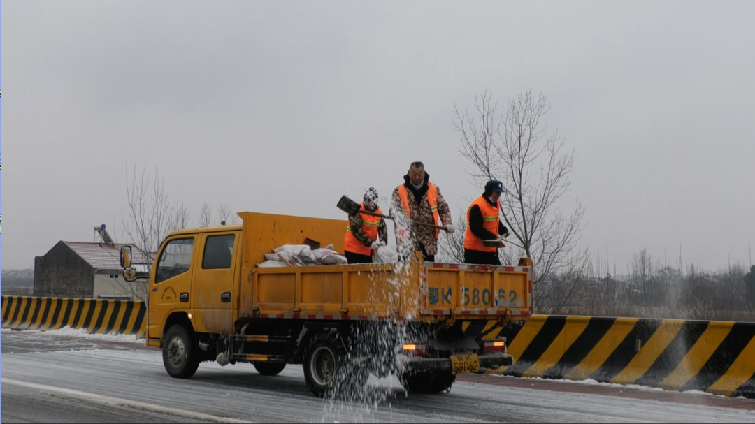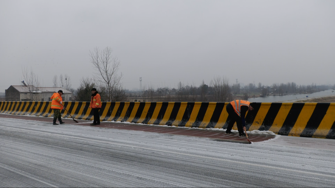 在江家竹林大桥,安陆市交通运输局应急专班人员冒着严寒,第一时间在桥面抛撒融雪剂,同时安排人员分时段开展路面铲雪作业,消除桥面积雪结冰。