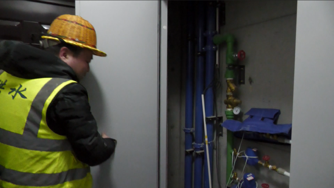 在水岸华府小区,供水巡检人员正在巡查检修楼栋水井的自来水管道,对裸露在外、没有包扎保温棉的水表进行及时处理,防止冻堵或冻裂现象的发生。