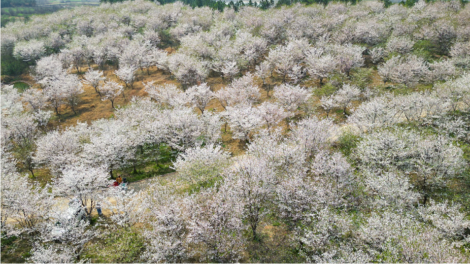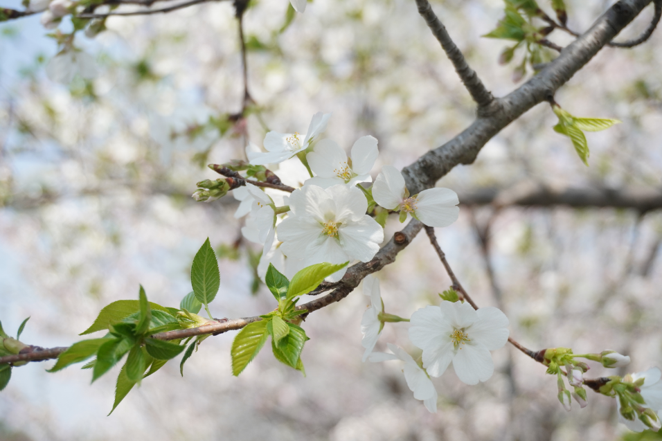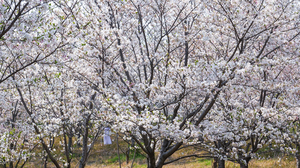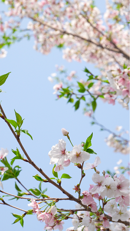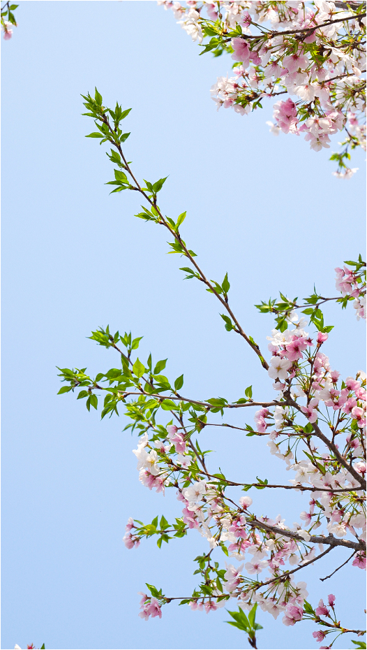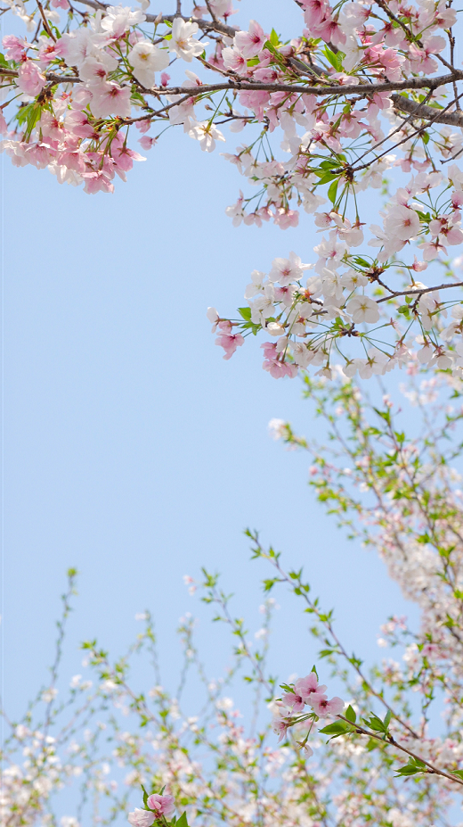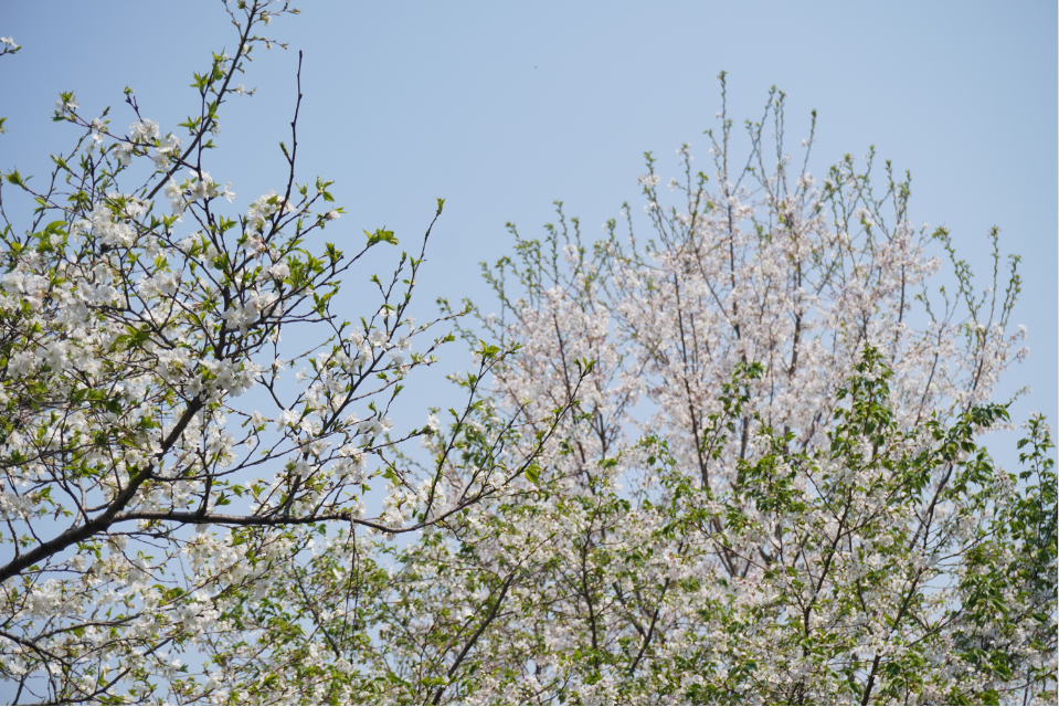一朵朵樱花簇拥在参差葱茏的枝桠间