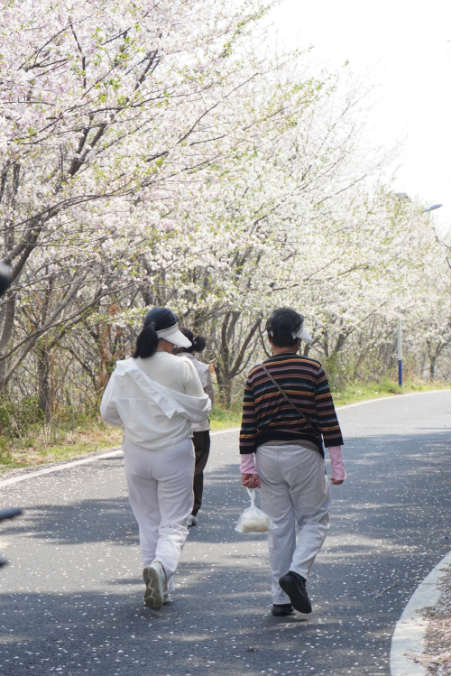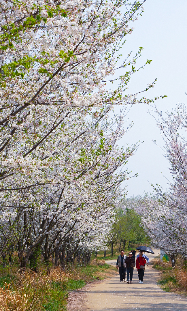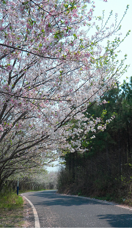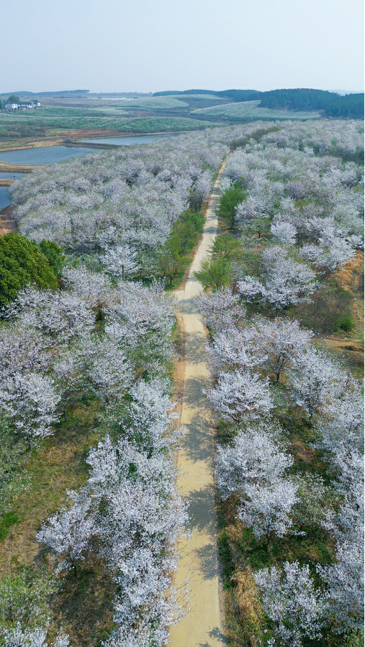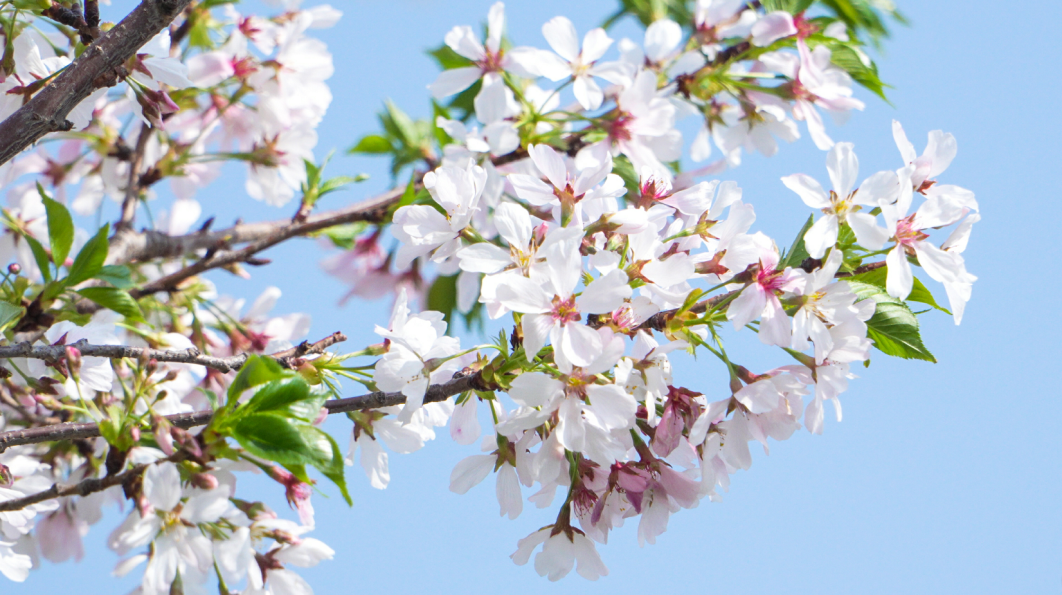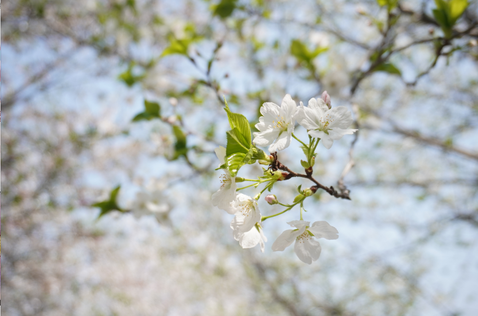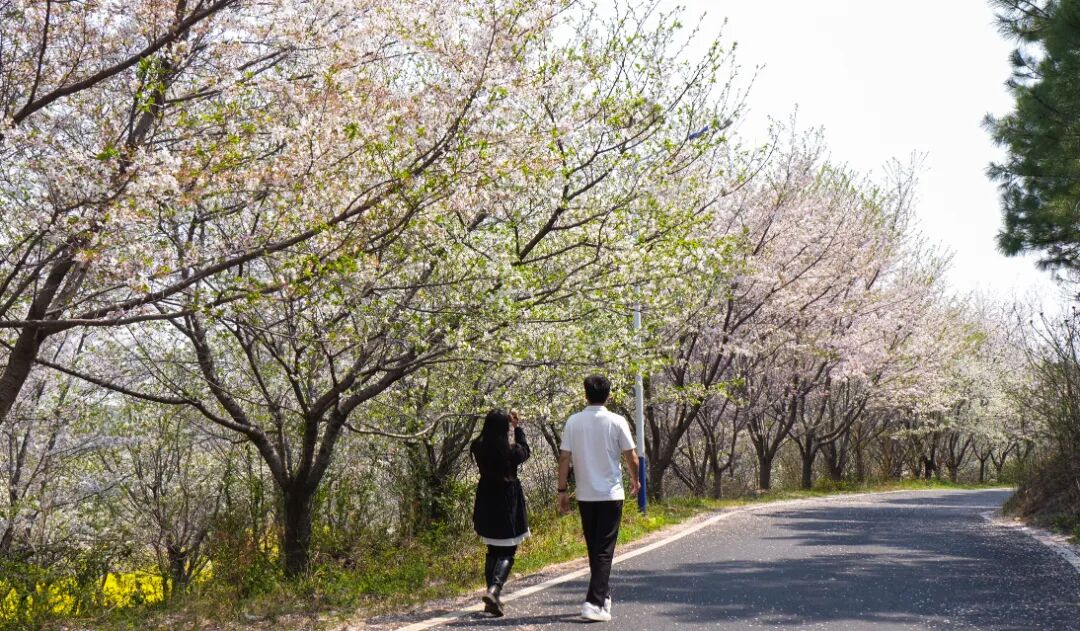 一朵朵樱花簇拥在参差葱茏的枝桠间
