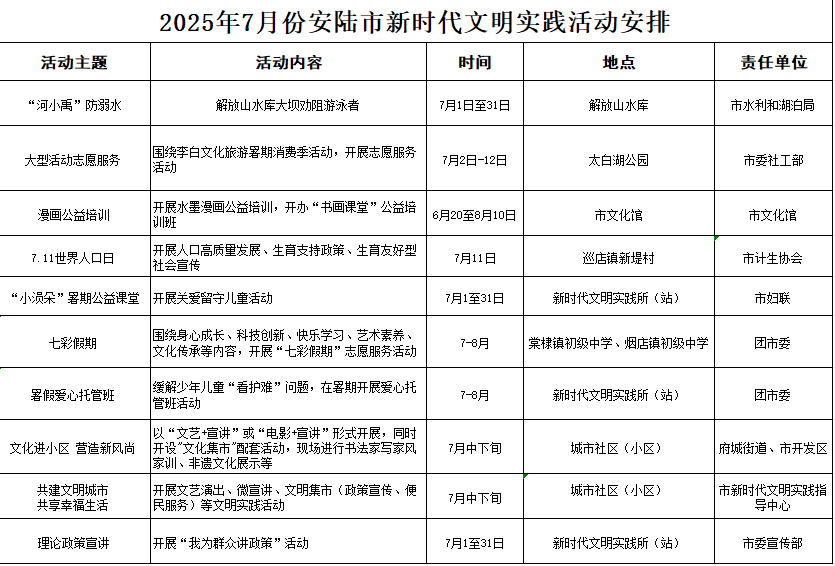 为推动安陆市新时代文明实践活动持续深入开展,安陆市新时代文明实践中心、所、站以贴近民生、服务群众为宗旨,以传播党的创新理论、做实关爱帮扶活动、弘扬时代新风为主要服务内容,拟广泛开展各类文明实践活动。现将安陆市新时代文明实践中心、所、站2025年7月活动计划如下: 文明实践活动时间安排表来啦! 心动不如行动 快快叫上小伙伴一起参与~ 2025年7月新时代文明实践志愿服务活动计划 (点开可放大图片)