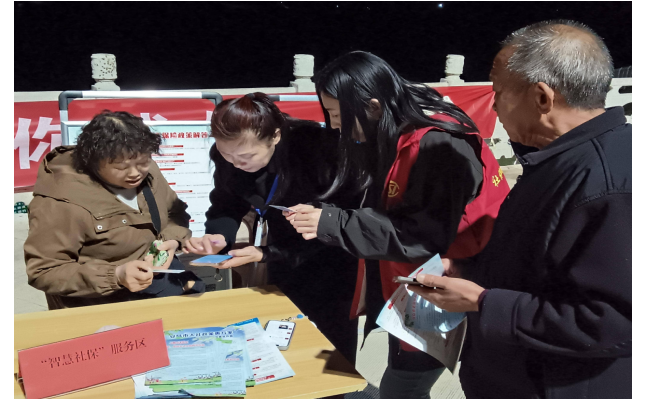 观景台入口的服务点上,“社保服务进万家 真情温暖你我他”的横幅在灯光下格外醒目。工作人员整齐摆放着政策宣传单和宣传展板,搭建起“迷你政务窗口”。