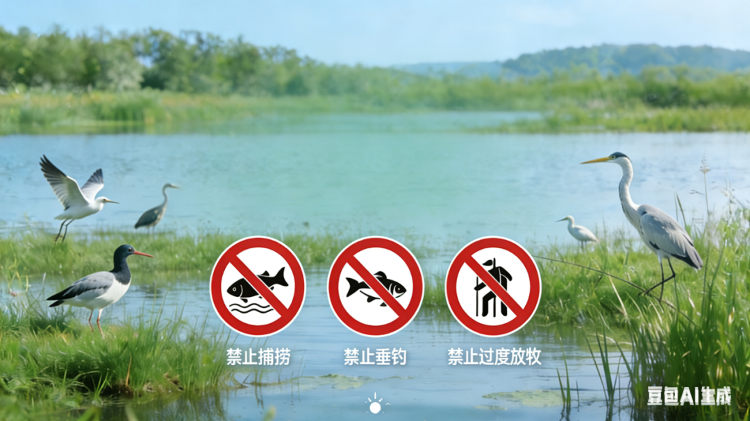 为了给候鸟营造安全的生存环境,湿地内全面禁止捕捞、垂钓、过度放牧等行为,周边5000公顷农田也全面取缔了高残留农药的使用,推广生态种植模式,从源头保障候鸟食物链的安全。