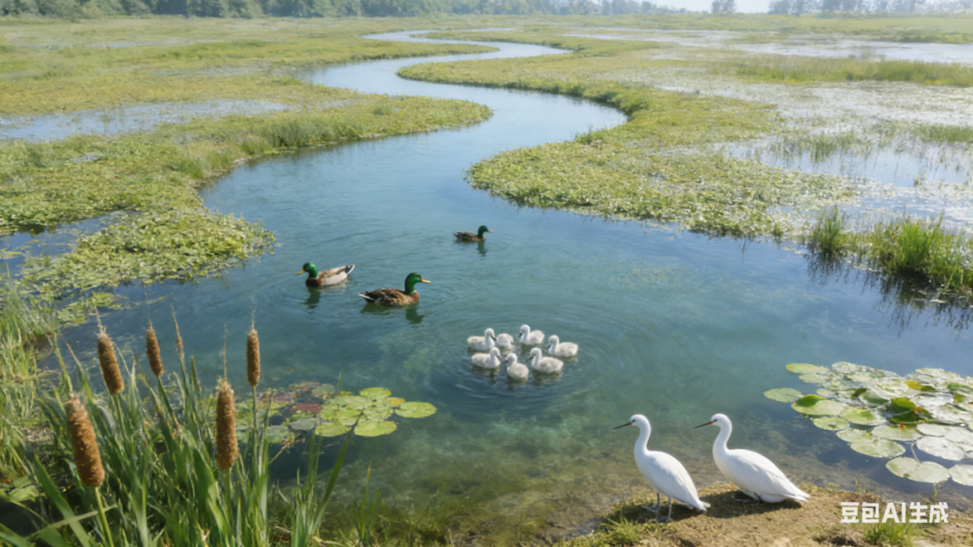 远处的人工湿地则种植了大片的菖蒲、鸢尾、美人蕉等水生植物,既能有效净化水质、涵养水源,又能为小型鸟类和昆虫提供栖息空间。