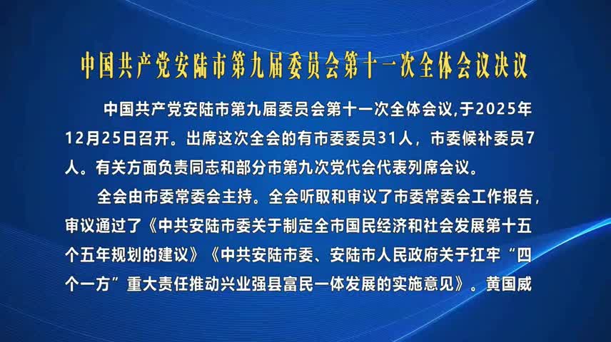 12月25日,市委九届十一次全会举行,审议通过《中共安陆市委关于制定全市国民经济和社会发展第十五个五年规划的建议》《中共安陆市委、安陆市人民政府关于扛牢“四个一方”重大责任 推动兴业强县富民一体发展的实施意见》《中国共产党安陆市第九届委员会第十一次全体会议决议》。全会在涢水大地引发热烈反响。