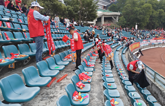 此次“贺岁杯”足球友谊赛,是安陆与深圳南山两地以球会友、增进交流的重要契机。比赛结束后,现场观众陆续离场,部分观赛垃圾留在了座椅与通道间。陈店乡新时代文明实践所的6名志愿者迅速行动,身穿红色志愿马甲,手持垃圾袋,沿着看台逐排清理塑料瓶、零食包装袋、应援道具废料等各类垃圾。他们分工协作,弯腰捡拾座椅缝隙中的杂物,整理归置可回收物品,将垃圾集中打包运送,忙碌的身影成为赛场边一道别样的风景线。