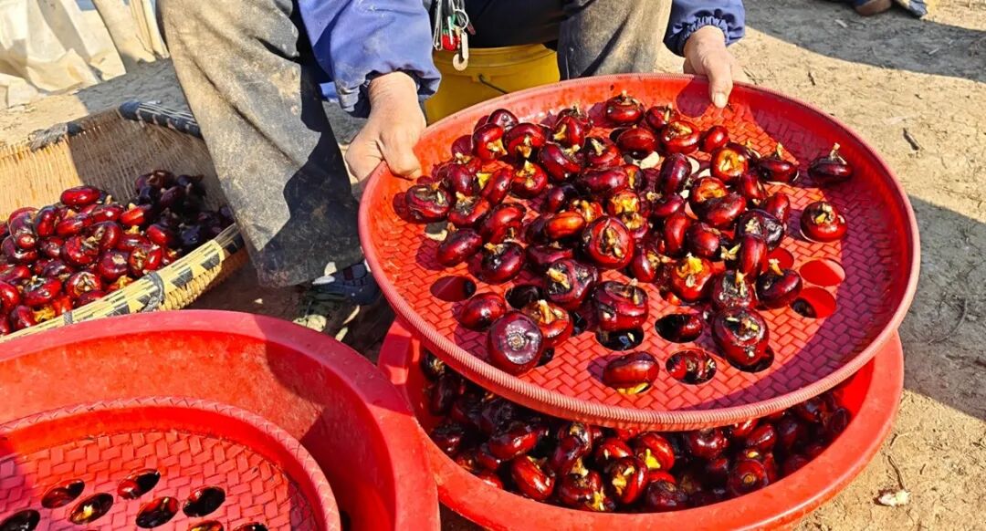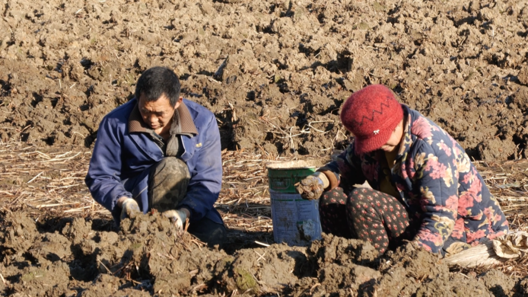 眼下正是荸荠采收的黄金时节,坦塘村的田间地头早已热闹起来。村民们深一脚浅一脚踩在带着薄霜的泥泞里,俯身、探寻、采挖,动作娴熟利落。一颗颗深紫色、圆滚滚的荸荠接连从湿泥中“探出头”,裹着新鲜的泥土气息,混着果实特有的清甜在田野间散开,为清冷的冬日绘就了一幅满是烟火气的丰收画卷。