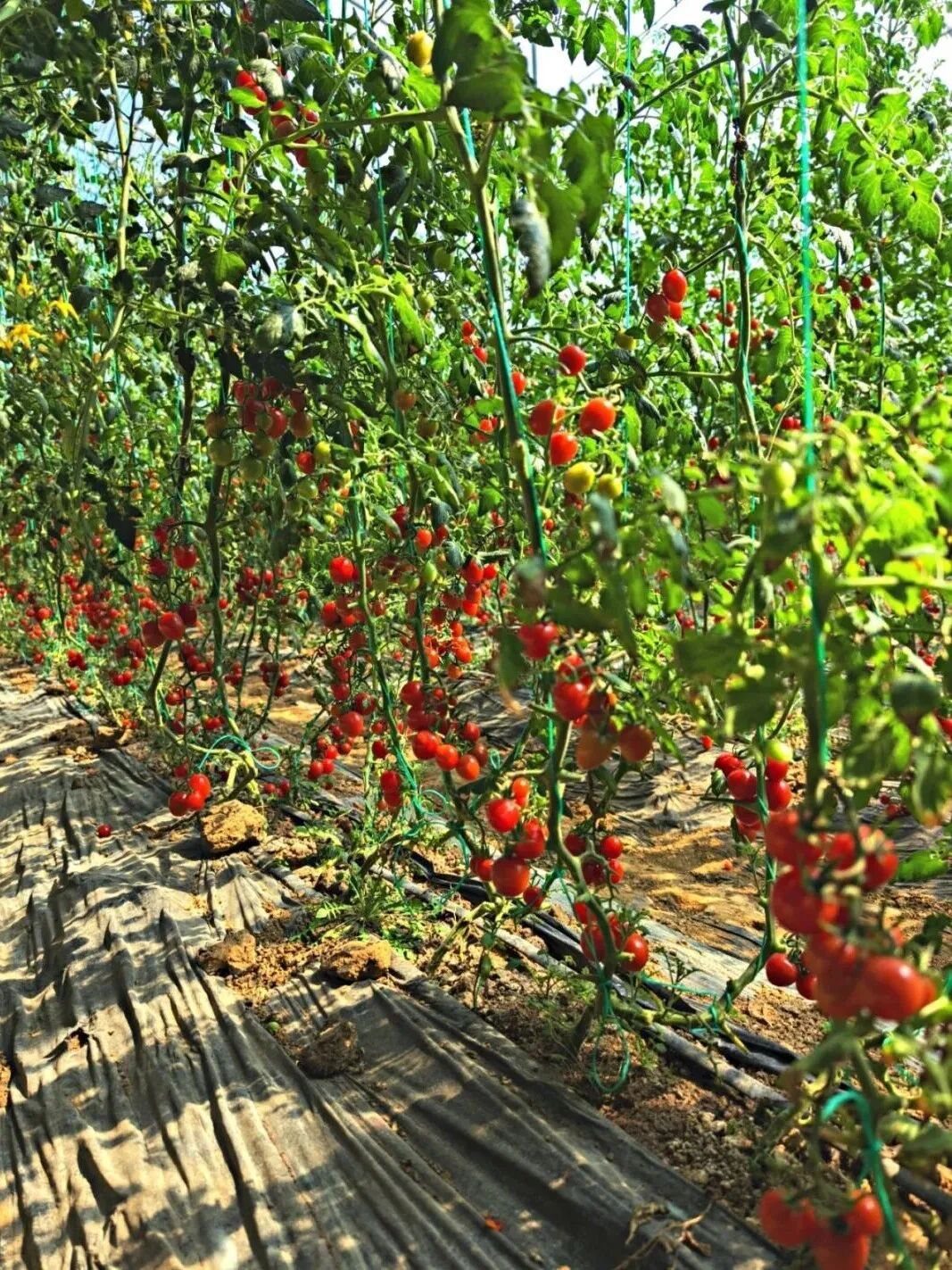 整齐的栽培架上,绿藤蜿蜒向上,红的、粉的、黄的小番茄错落垂挂,颜值与口感双在线。