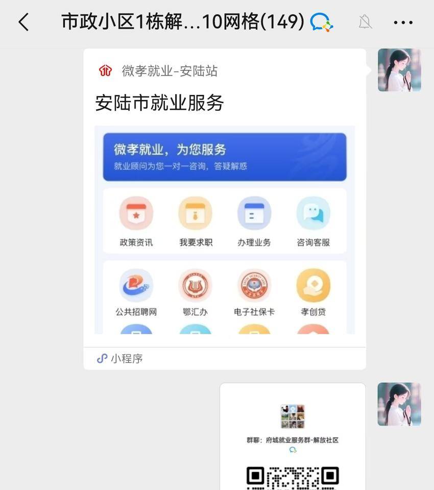 线上,社区工作人员将“安陆就业服务”群及二维码推送至各居民群,并针对有明确意愿的居民进行点对点发送。线下,工作人员提前梳理返乡人员基本信息,手持“微孝就业安陆站”二维码主动上门,引导居民扫码即可快速获取本地招工岗位,搭建起求职者与企业间高效便捷的对接平台,省去了居民四处寻找信息的时间与精力。