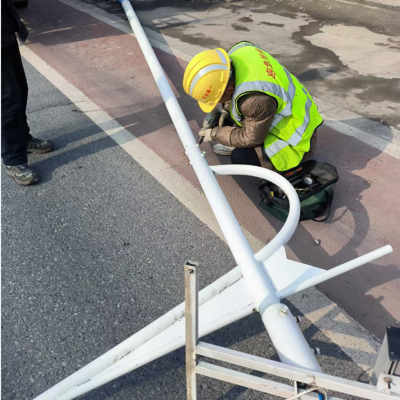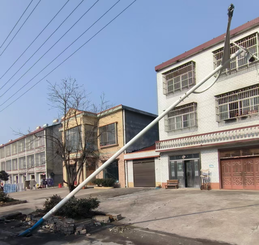 抢修人员抵达后,第一时间设置安全警戒区域,防止二次事故发生,并立即开展现场清理工作。经检查,灯杆主体及太阳能板组件损坏严重,已无法原地修复。为尽快恢复道路通畅、保障居民出行安全,抢修人员决定采取临时拆除方案。他们利用专业设备,对倒伏灯杆及附属设施进行安全切割与移除,迅速清理出通行通道。