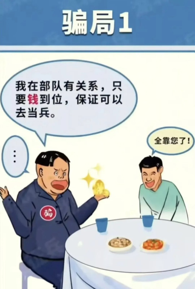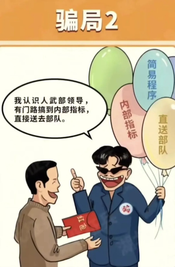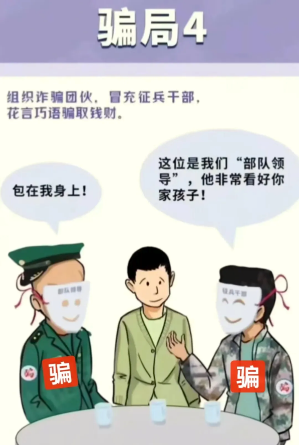 4.谨慎核实身份信息,对自称“征兵干部”“部队领导”“有关系”的,要求其出示工作证件并向征兵办核实,切勿轻易转账付款。